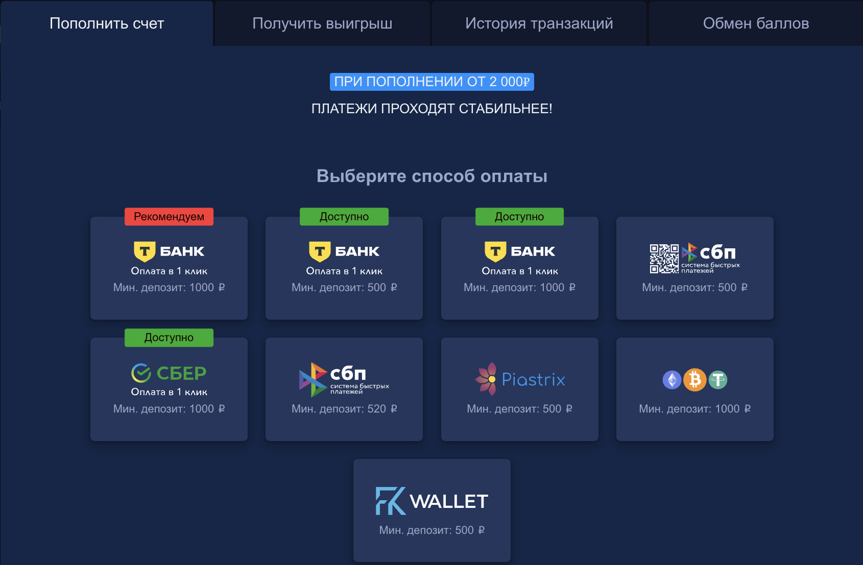 Для финансовых операций используется встроенная онлайн-касса. Пополнить баланс или вывести выигрыш можно через: